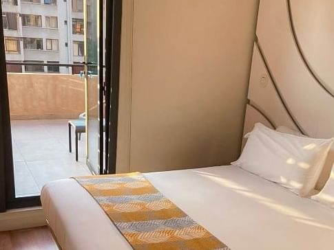 Step into a bright, modern room with a king bed and everything you need to unwind—49" LED TV, Wi-Fi, phone, air conditioning, minibar, and a sleek bathroom. Step outside to your private terrace and take in views of the vibrant city skyline.