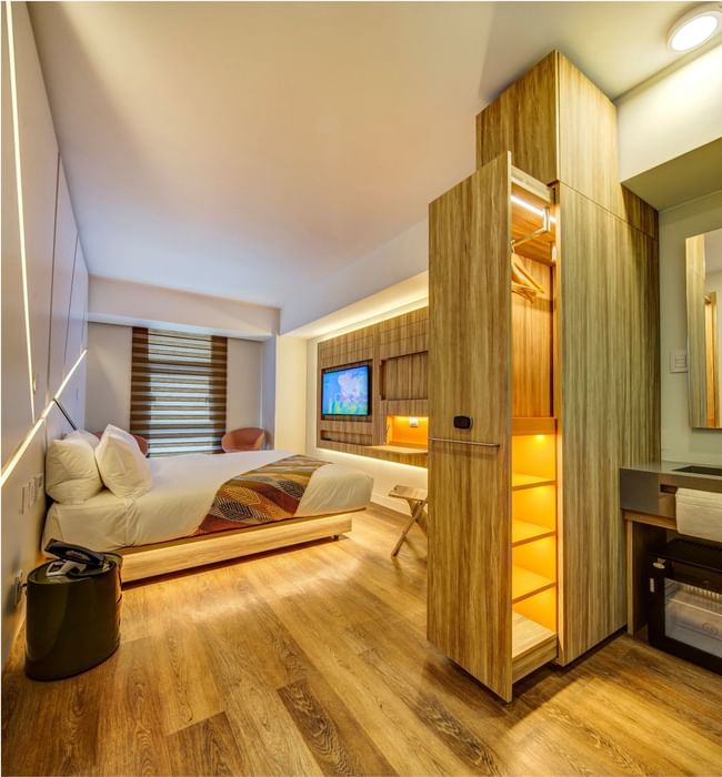 Nuestras habitaciones Corner King de 22m2 cuentan con un televisor Led Samsung Hospitality de 49", escritorio y silla de trabajo, ducha y minibar con agua de cortesía.